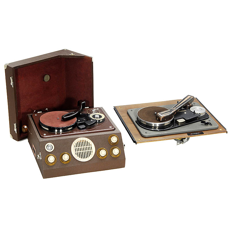 Each with turntable for 78 rpm discs. 1) Manufactured by: Siemens – Austria, "Drahtmagnetofon Tonmeister, Type ST 701/3 LFR", portable, 110–240 V, with con-nections for radio, microphone, amplifier and loud-speaker. – And: 2) Manufactured by: Autophon AG, Switzerland, "Autophon T61R" , built-in unit, 220 V.