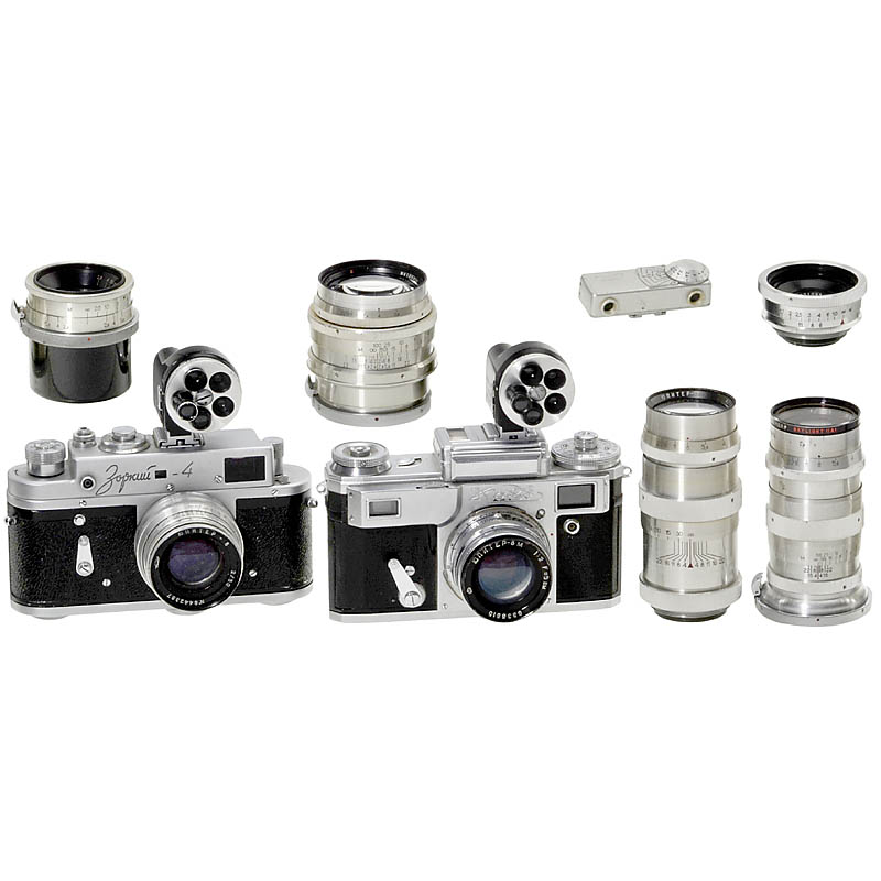 2) Krasnogorsk. Zorky-4,c. 1956. With 3 lenses: Orion-15 6/28 mm, Jupiter-8 2/50 mm and Jupiter-11 4/135 mm.