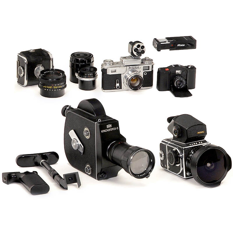 1) Kiev 88, with wide-angle lens 3,5/30 mm and 2,8/80mm, CdS prismfinder, 2 magazines. (2–3/–)