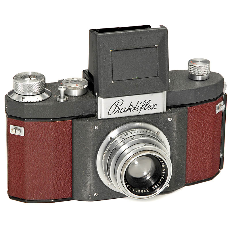 black body with dark-red leather covering, Xenar 2,8/5 cm. –Rare early Praktiflex version!– (3–2/2-)