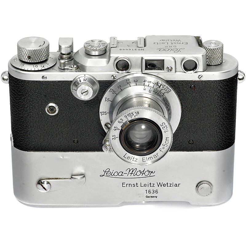 Leitz, Wetzlar. No. 316688, with Elmar 3,5/5 cm. MOOLY Leica-Motor no. 1636, intermediate model with immobile speed selector switch.