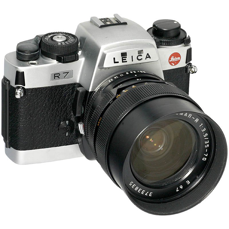 Leica R7 with Vario-Elmar-R 3,5/35–70 mm, c. 1992 Leitz, Wetzlar. Leica R7, chrome, no. 1919465,