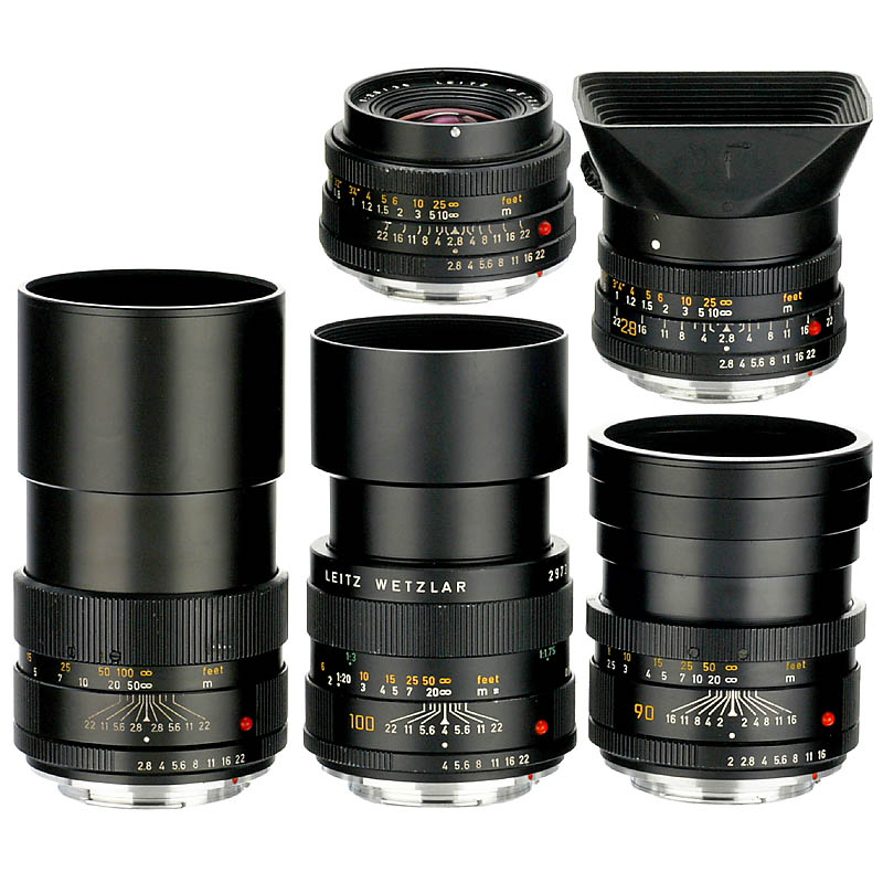 1,Leitz Canada.Summicron-R 2/90mm,no.3075354, E55滤镜,有光圈和镜套 2,Emarit-R 2,8/135mm,no.2772511,有7-Ring系列和两个镜头盖 3,Leitz,Wetzlar.Macro-Elmar-R 4/100mm,no.2973712,有两个镜头盖 4,Elmarit-R 2,8/35mm,no.2668685,第二版本的7系列滤镜和两个镜头盖 5,Elmarit-R 2,8/28mm,no.2920538,7系列滤镜,不易聚光,有12509遮光罩和两个镜头盖所有镜头有3片凸透镜