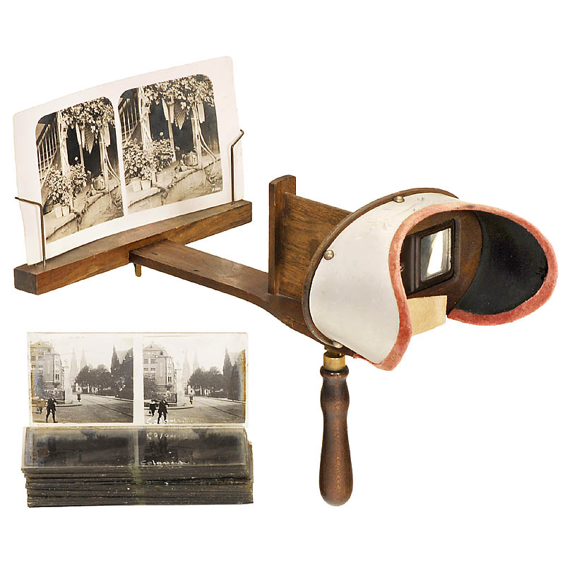 Stereo Viewer System Holmes Unmarked, for stereo cards 9 x 18 cm, with one card. Add-on: 19 stereo slides (black and white) of Cologne, 6 x 13 cm. – (3+/2-)