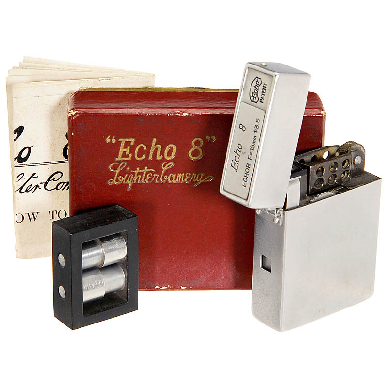 Echo 8, 1951 Suzuki, Japan. Size 5 x 5 mm on 8 mm film, designed to look like a Zippo lighter, Echor 3,5/15 mm, diaphragm 3,5–16, shutter I. + B., size of the camera 58 x 47 x 17 mm, with original box, instruction manual and very rare cutter! – Rare!– (2-/2-)