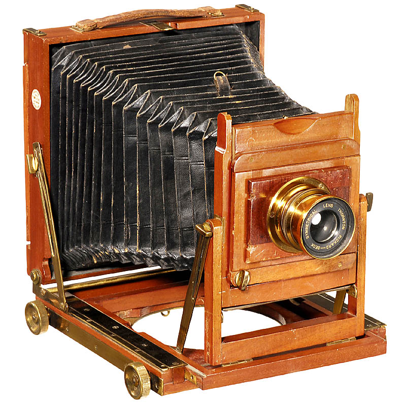 mahogany with brass trim, brass lens: "Thornton-Pickard