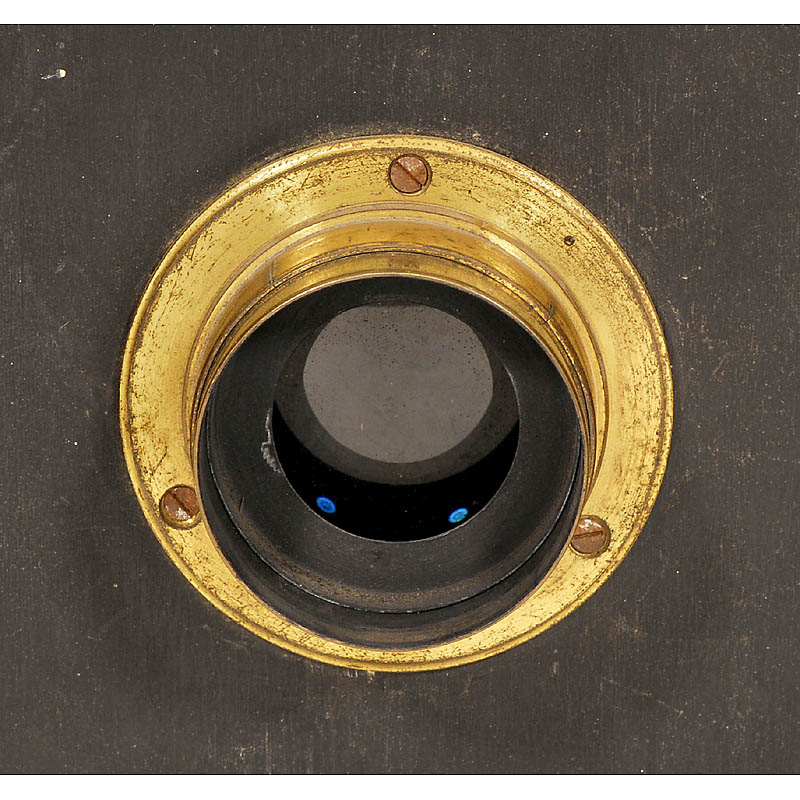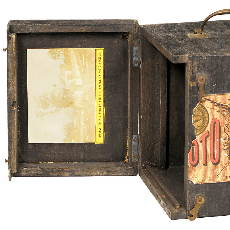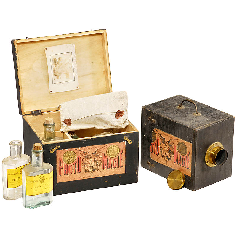 chemical box inside has the name label "Maison A. Giroux". Alphonse Giroux is well known as brother-inlaw of Daguerre and manufacturer of Daguerre's cameras. He worked as well together with the magician Robert-Houdin, who established in 1845 the "Théatre de Magie", probably the inspiration of the camera's name "Photo Magie". – An outstanding sample of the early photographic history!– (3/2)