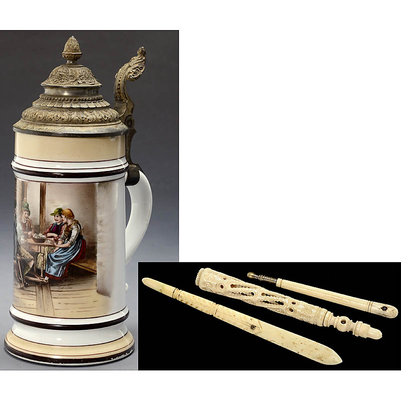 And: An unmarked pottery beer mug with hand-colored motif, pewter lid and an erotic lithophane in the base.