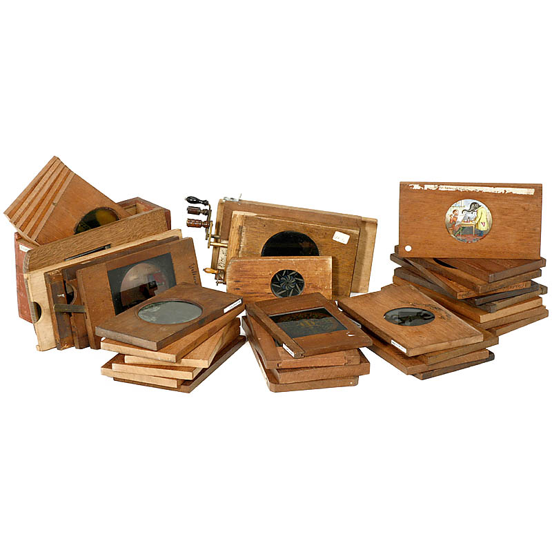 A large lot of approx. 35 wood-framed lantern slides in different sizes. Printed and hand-painted.