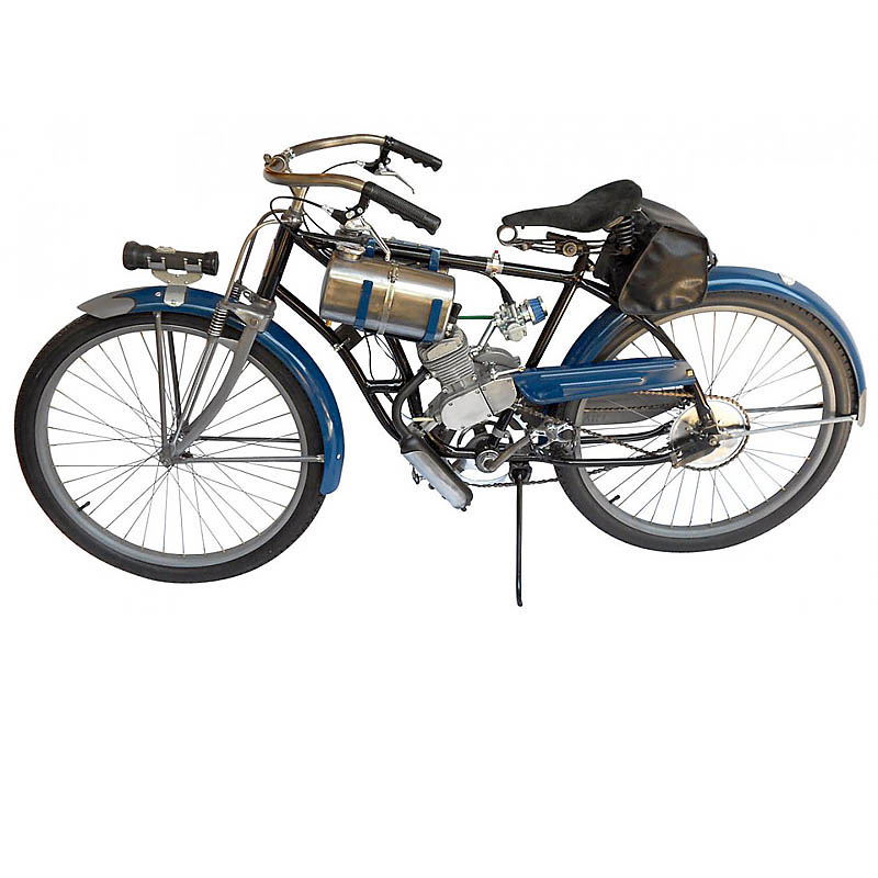 2 cylinder, 66 cc, double tank, detachable front lamp, spring front wheel, leather seat, saddleback, blue/black paint, excellent restored or rebuilt. Hard to find in Europe!