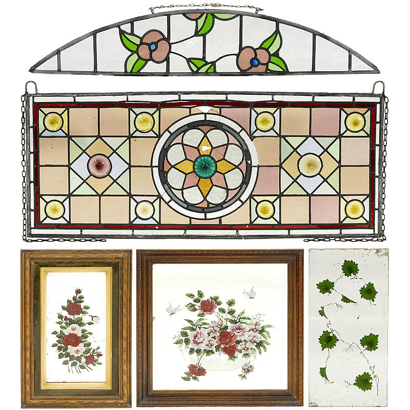 3 Mirrors and 2 Leaded Window Panes, c. 1910