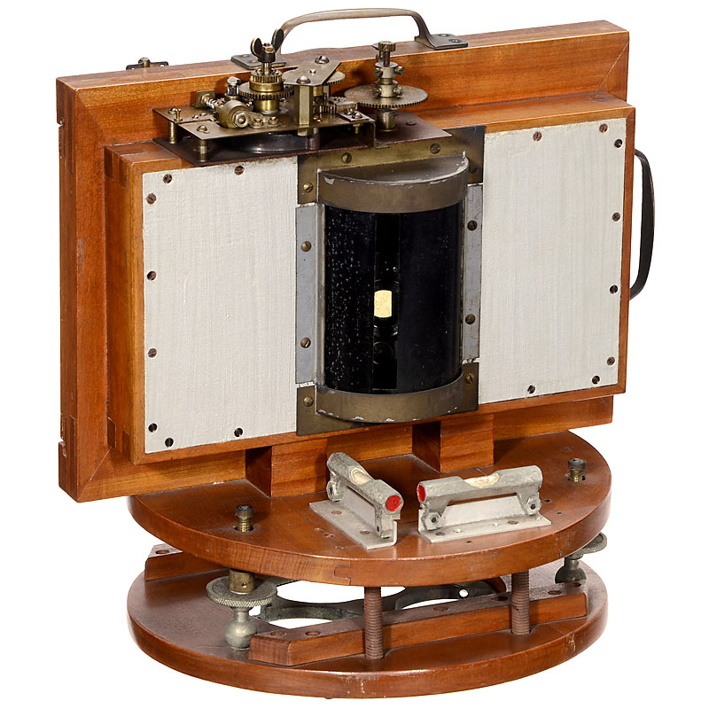 Unmarked, photograph format approx. 12 x 30 cm (4 ¾ x 11 ¾ in.) for sheet film, interesting clockwork mechanism for shutter winding (working!), with Goerz Dagor 6,8/12,5 cm, tropical wood, round camera table with leveling screws. With original wooden box. – Unusual panoramic camera.