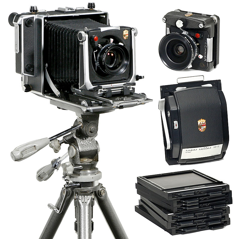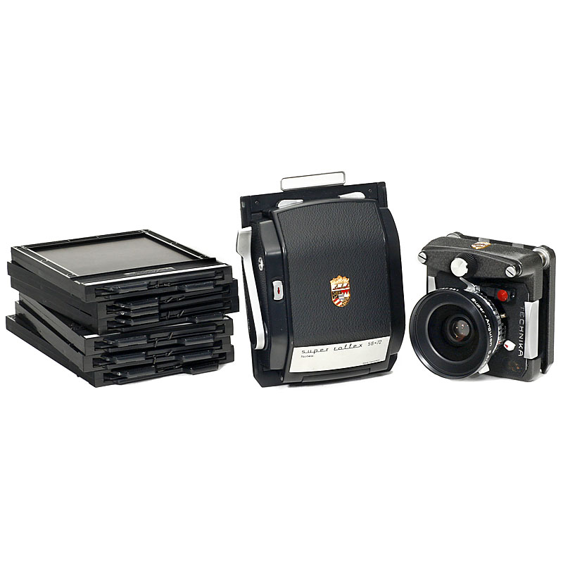 1) Master Technika 9 x 12 cm/4 x 5 in., no. 6415236, with focusing screen back.