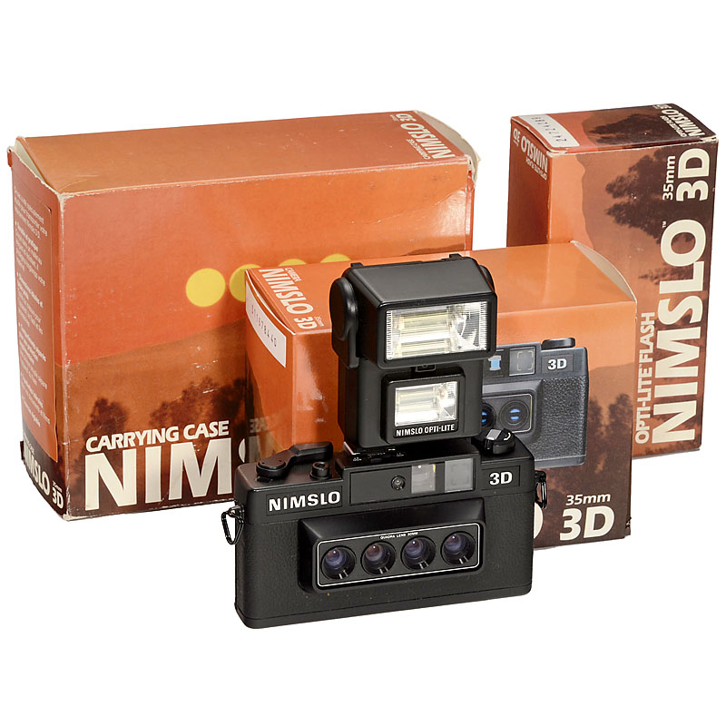 Nimslo, Japan. 1)Nimslo 3D camera, with paperwork and box. 2)Nimslo 3D Opti-Lite flash, with box. 3)Nimslo 3D carrying case, with box. – Add-on:Nimslo flyers und test pictures.