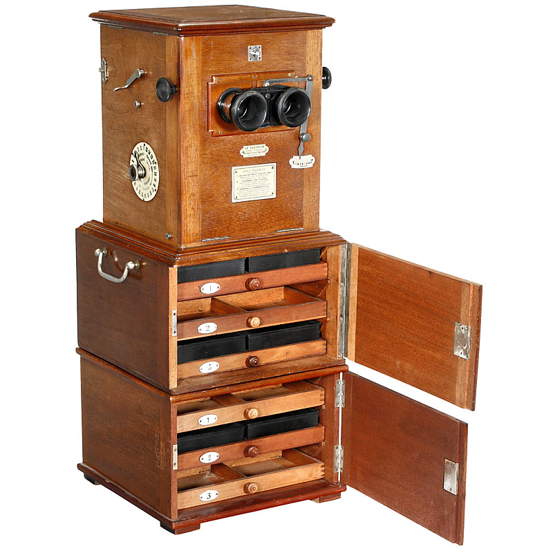 Jules Richard, Paris. For slides (45 x 107 mm), polished wood body with celluloid plaques and nickel-plated fittings. On 2 base cabinets for 12 magazines each.