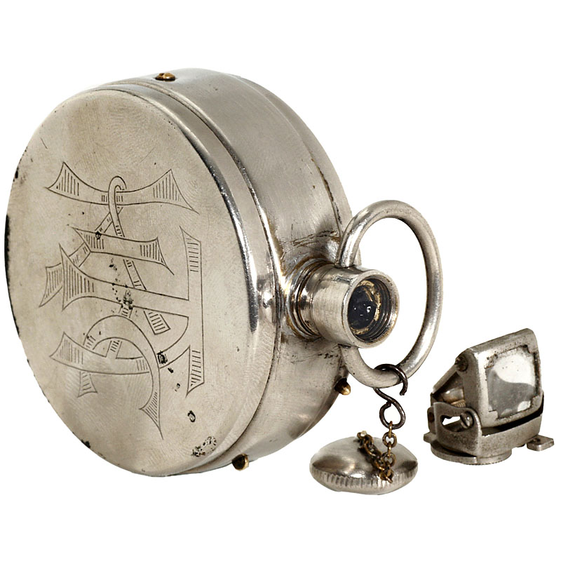 Houghtons, London. For 25 exposures 16 x 22 mm on special cassette, fixed-focus lens 16/30 mm, with viewfinder (not complete) and original lens cap. – Soughtafter watch camera.