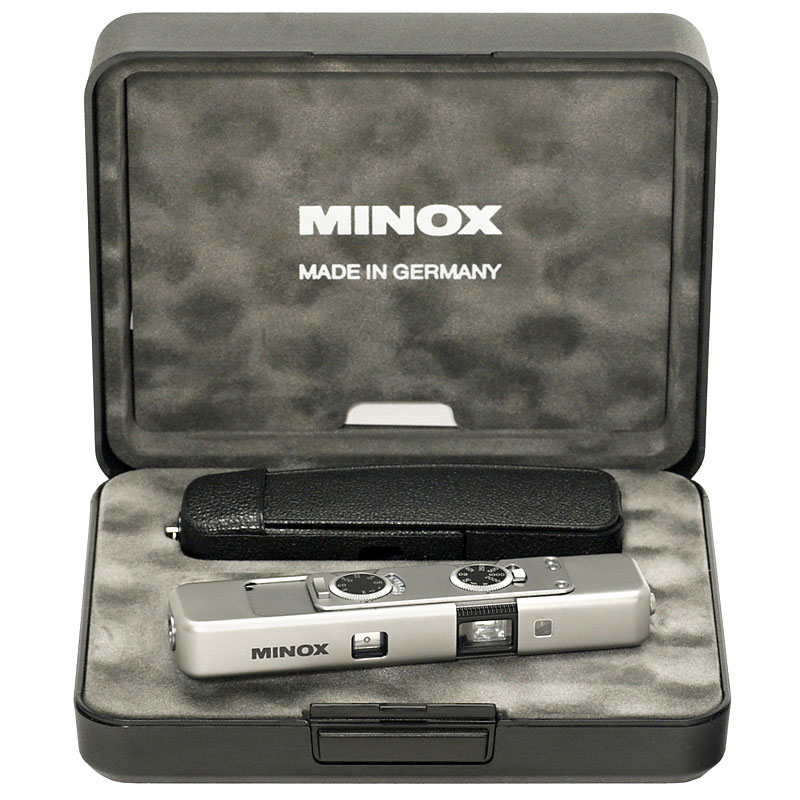 Minox, Gießen. No. 2600184, titanium-bodied version. With chain, leather case, inner and outer box. Like new!