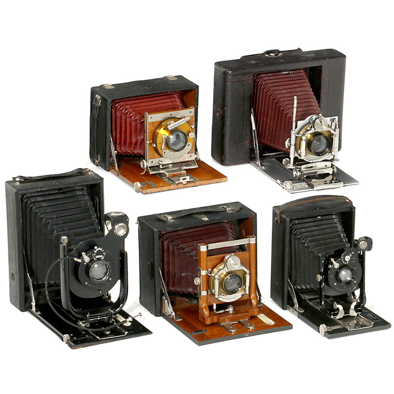5) French folding plate camera, c. 1910, for platesand rollfilm 9 x 12 cm, Roussel Bi-Anastigmat 1:8, shutter 1–1/100sec.