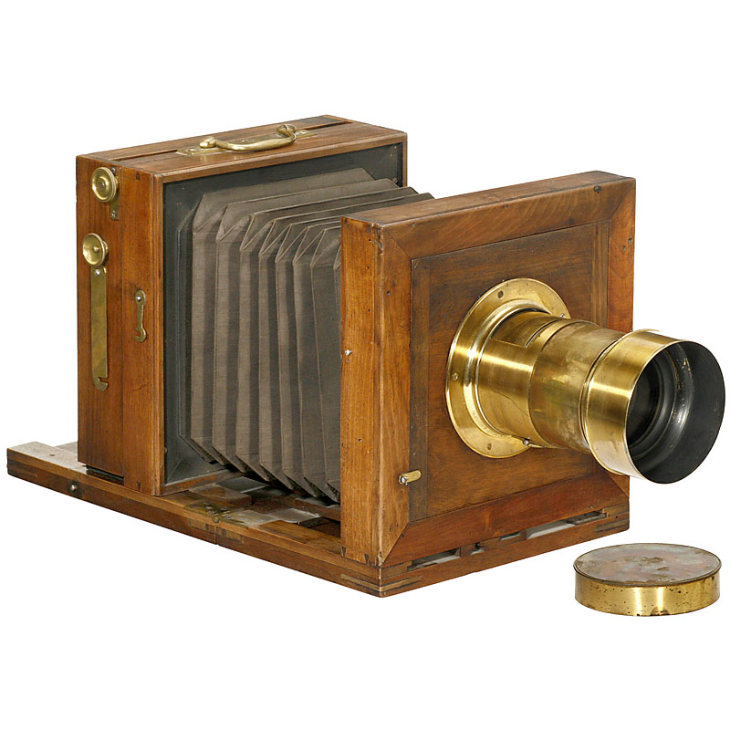 Unmarked. Polished wood with brass fittings, plate size 6 ¾ x 6 ¾ in., black bellows, central focusing. With focusing screen back. – Lens: unmarked, serial no. 2004, rack-and-pinion focusing, for waterhouse stop, lens size: 8 ¾ in., Ø 4 ⅓in., brass lens cap.