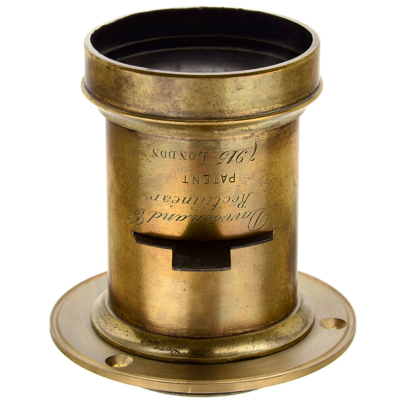 "Darvson and Co., London". Small brass portrait lens, approx. 35 cm focal length, for waterhouse stop, height of the lens 4 in., Ø 2 ⅓in., with connecting ring.