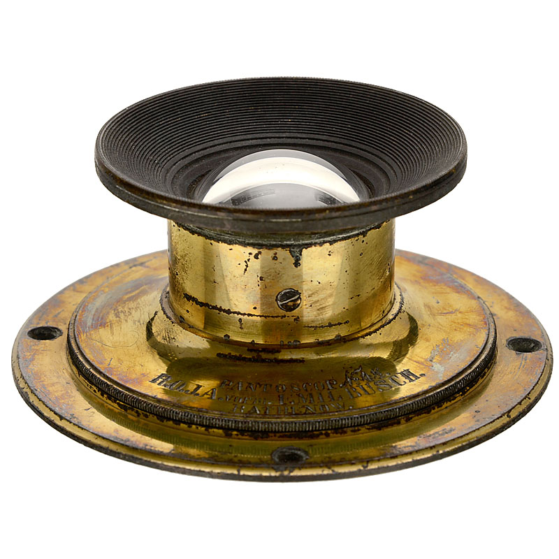 "R.O.J.A. vorm. Emil Busch, Rathenow". Brass-bound lens, for waterhouse stop, glass very clean, connecting ring. – Historically very important!