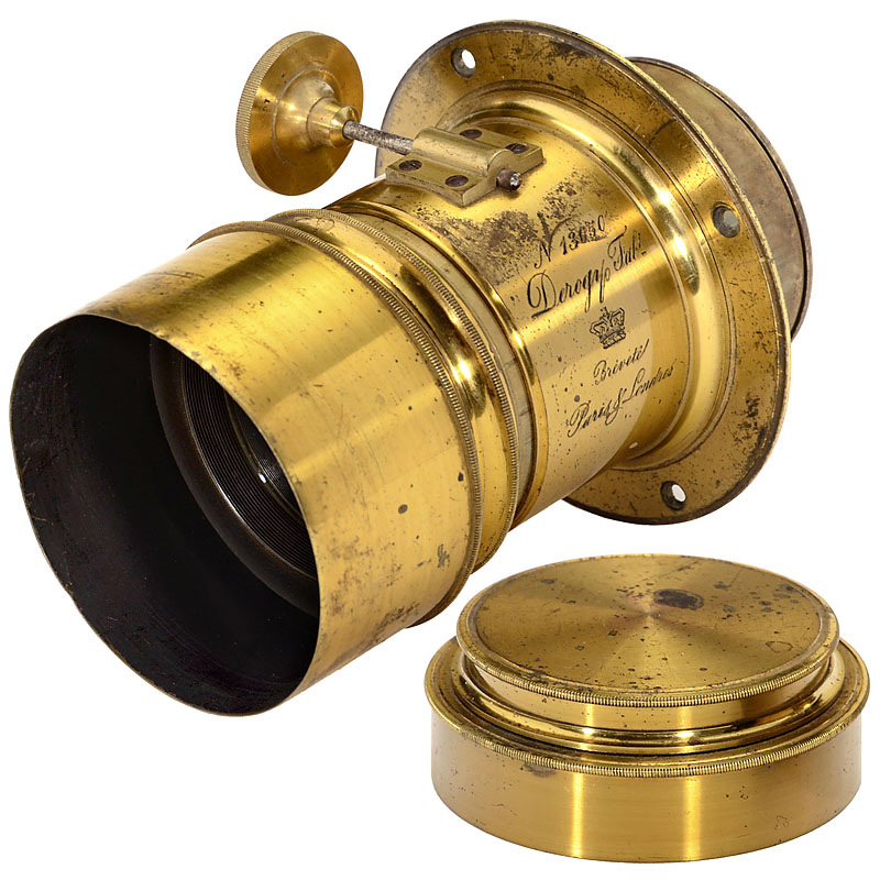 "Derogy Fab.t Breveté Paris & Londres", Nr. 13050, portrait lens, rack-and-pinion focusing without waterhouse stop slot, approx. 30 cm focal length, height of the lens with lens hood 6 in., Ø 3 1/6in., brass cap and connecting ring. – Literature:Corrado D'Agostini, "Photographic Lenses of the 1800's in France", p. 161, left (engraving: p. 163, left)