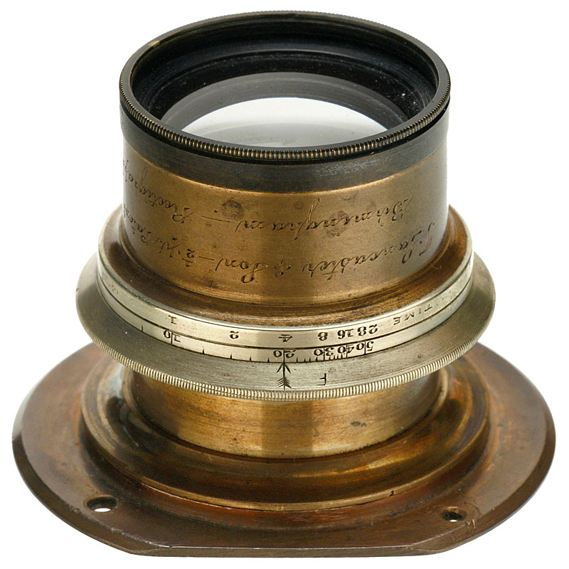 Lancaster & Son, Birmingham, England. Brass/copper lens, approx. 25 cm focal length, iris stop, height 2 in., Ø 1 ½ in., connecting ring. Very clean optics.