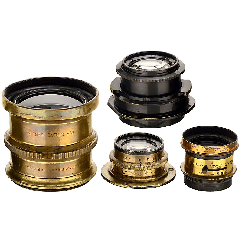 1)Goerz, Berlin. Doppel-Anastigmat Serie III. No. 7 F=360 mm, no. 104810, iris stop, height 2 ¾ in., Ø 2 ¾ in. – 2)Goerz, Berlin.Dopp.-Anastigmat Syntor 6,8/180 mm, no. 364155, iris stop, height 1 2/5in., Ø 1 ½ in., connecting ring. – 3)Schneider-Kreuznach. Xenar 4,5/15 cm, iris stop, height 1 ½ in., Ø 2 in., connecting ring. – And:4)Ross, London. "Goerz Patent" 5 in. Double Anastigmat F:7,7, iris stop, height 1 ½ in., Ø 1 ½ in.
