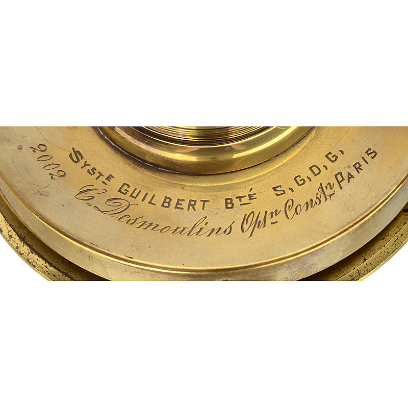 "SYSTEGUILBERT BTÉS.G.D.G., C. Desmoulins OptnConstrPARIS", no. 2002, iris stop and built-in shutter (shutter speeds "0–8"), height of the lens 4 in., Ø 2 ¾ in., connecting ring.– Rare lens by a small manufacturer!