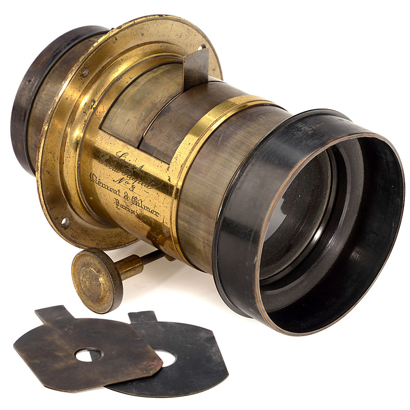 Clement & Gilmer, Paris, formerly Gasc & Charconnet. Portrait lens with 3 waterhouse stops, rack-and-pinion focusing, connecting ring, height of the lens 8 ¼ in. Ø 4 ¾ in. – Literature:Corrado D'Agostini, "Photographic Lenses of the 1800's in France", p. 298 (similar example at the bottom left).