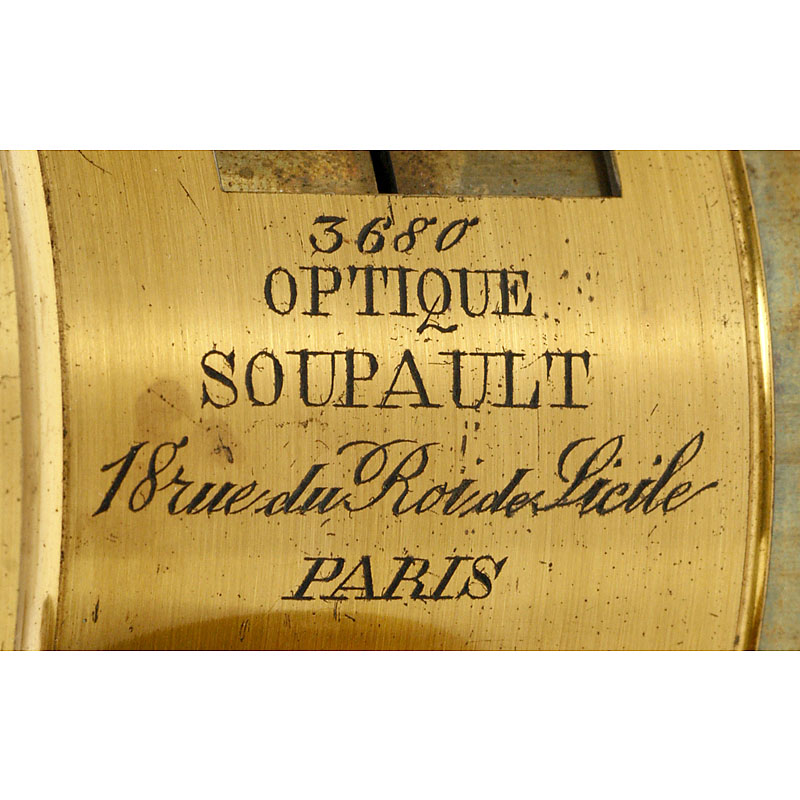 Unmarked, photograph format approx. 4 1/3x 4 1/3in., polished wood with brass trim, brown bellows, focusing screen back and 2 cassettes, plate holder with nice collodion stains, size of the board: 10 1/5x 6 ¾ in. Lens: Optique Soupault, 18 rue du Roi de Sicile, Paris.Lens no. 3680, Petzval-type, for waterhouse stop, rackand-pinion focusing. – Very rare lens by a small French manufacturer!
