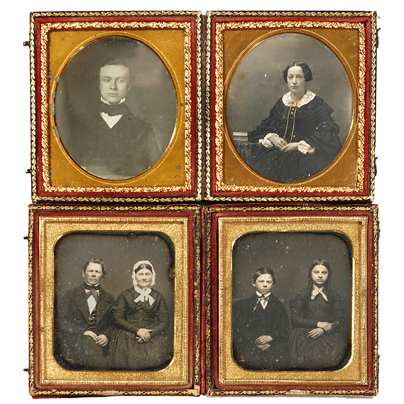 Presumably USA, 2 double cases, 4x 1/8plate, portrait photographs, partly hand- and gold-colored, cases with decorative ornaments.