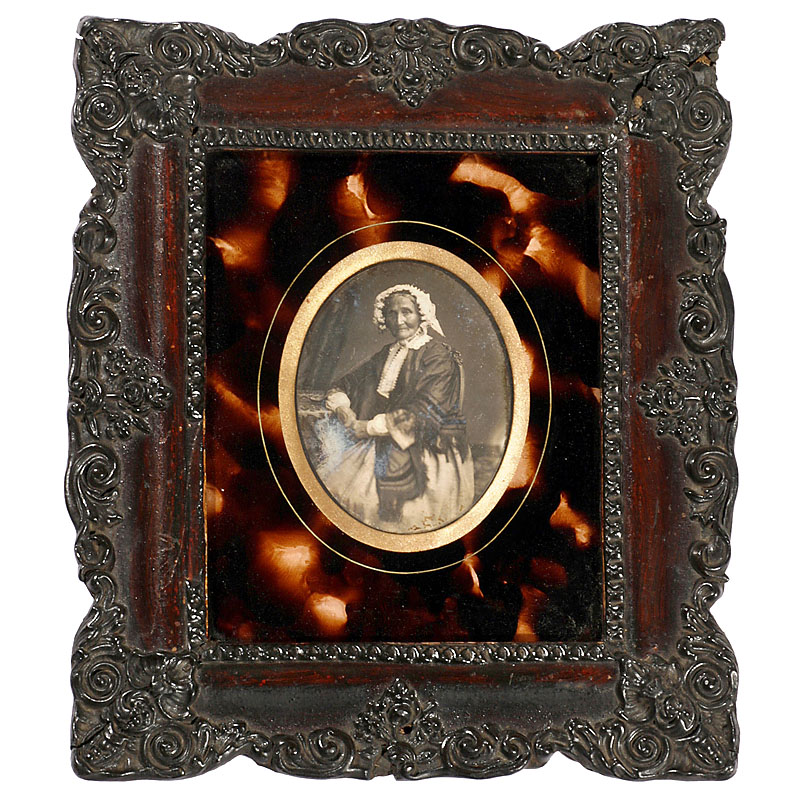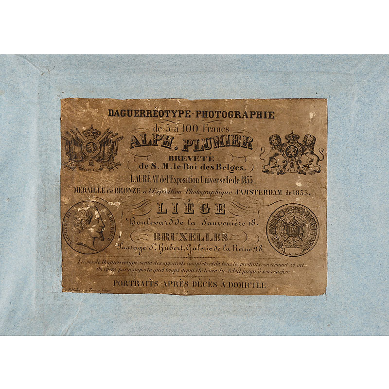 "Daguerreotypie-Photographie Alph. Plumier Breveté de S.M. le Roi des Belges", approx. ½ plate, portrait of a lady, visible image size: 2 ¾ x 3 ½ in., plaster frame, external dimensions: 8 ¾ x 9 7/8in.