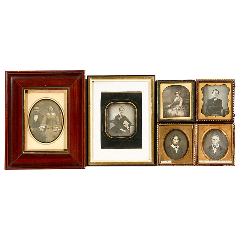 Predominantly from France. Visible sizes: 5,5 x 6 cm (1/9plate), 6 x 7 cm (1/6plate), 7 x 9 cm (1/4plate). Portrait photos, partly hand-colored. 2 daguerreotypes with new frames and 4 unsealed daguerreotypes.