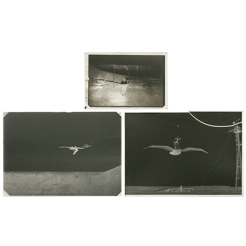 Original negative plates, the 1st flight of a person. Plate sizes: 4 ¾ x 6 ¾ in. and (2 x) 7 x 9 ½ in. (1 plate with crack). – Add-on:Book by Otto Lilienthal, "Der Vogelflug", 2nd edition, 1910.