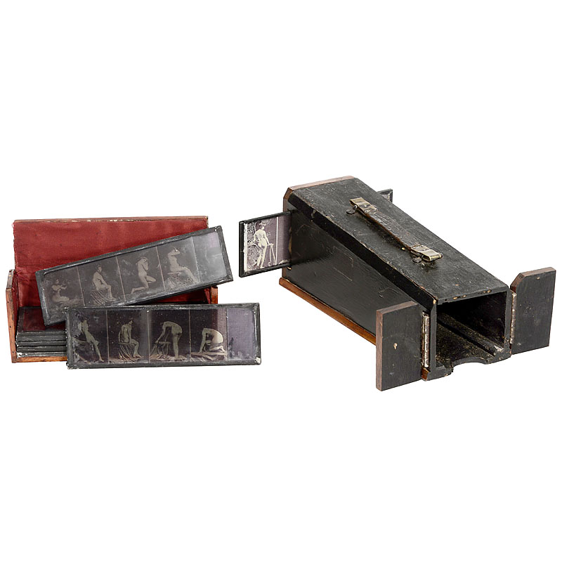 Unmarked peep-show box, size: 10 x 3 ½ x 3 1/6in., with 8 slide strips (erotic and porn), 2 x 6 ¼ in.