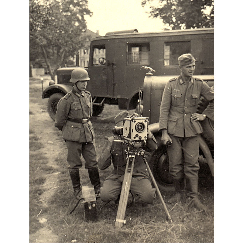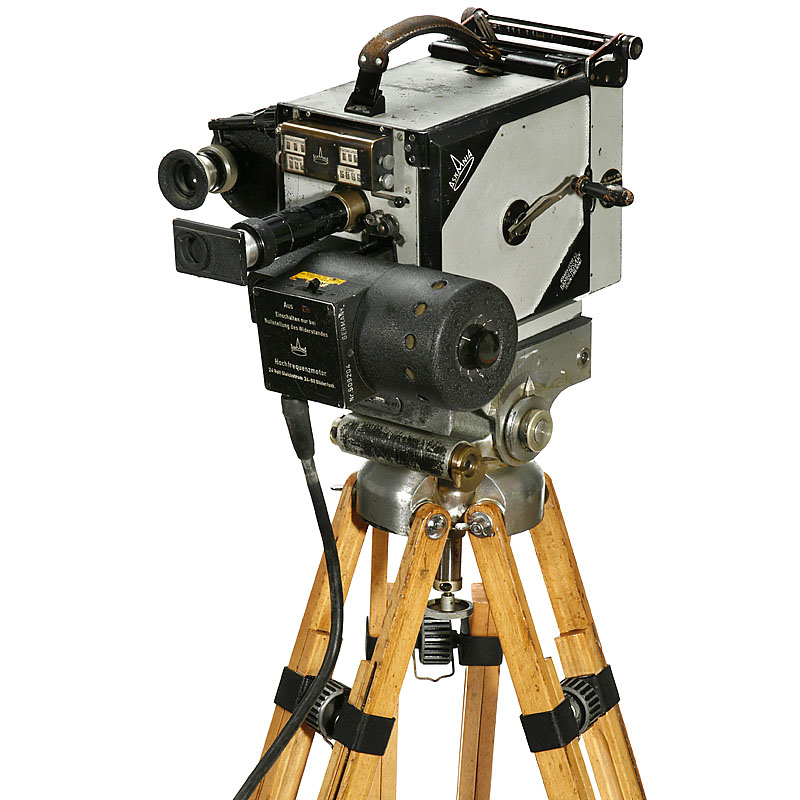 Manufactured by: "Bamberg-Werk, Berlin", for 120 m film (2 cassettes inside), Astro Gauss Tachar 1:2/75 mm lens, with viewfinder magnifier in the camera and the rare Astro long-distance viewfinderon the left side, electric motor or handcrank drive. – Add-on:Cradlehead tripod by "André Debrie, Paris" and a Din A4 size photo of an Askania Z camera during WWII.