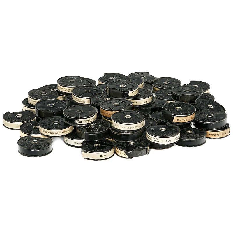 By "Pathé, Paris", missing crank, in original box, with approx. 90 films in tin cassettes.