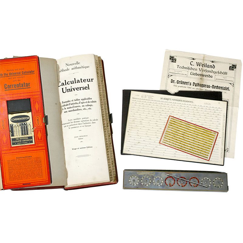 1) "Addometer", c. 1920. American 8-disc calculating device. With pen. (3-/2-) – And:2) Bergman "Universal Calculator", 1924. Book-form index table with enclosed feed-rack adder "Correntator". (3/–)
