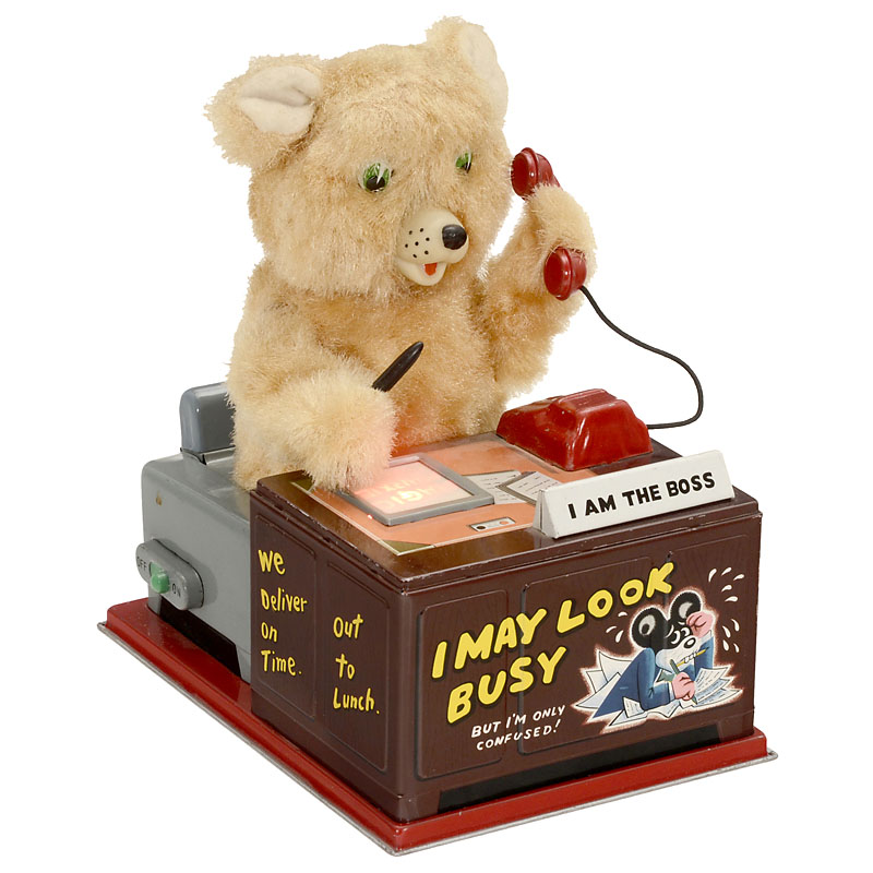 Amusing battery-operated tin toy by Linemar Toys, Japan. When the phone rings, the bear picks up the receiver and "talks" with serious gestures, then "writes" down some notes. Excellent condition!