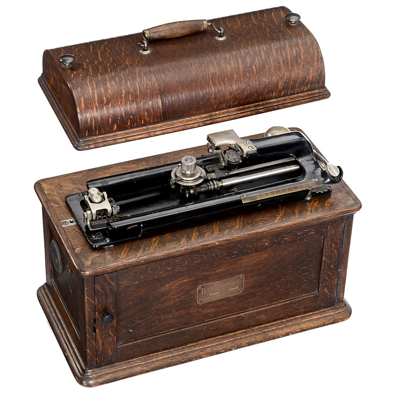 By American Telegraphone Co., model 102, serial no. 125, patent no. 934843 from 21 September 1909, for recording and storage on magnetic discs, with 110 V electric motor, recording and storage head, oak case and lid (probably by Columbia Graphophone Co.). In good original condition. The American Telegraphone Co. was founded by Valdemar Poulsen in 1903. Poulsen registered his first patent for a wire-recording device in 1898 and unveiled his completed machine to the public at the Paris world exhibition in 1900 when he played a recording of Kaiser Franz Joseph's voice: a recording still in existence today. Further developments led to the model for recording and repeating on magnetic discs(patented by Frederic Schaefer) offered here. Although revolutionary for its time, the Telegraphone's sound fidelity was considered inferior to that of Edison's Dictaphone and Poulsen's invention did not meet with financial success, as a result of which few units were produced. Only with the invention of the amplifier did this type of technology eventually take off. All of today's magnetic-recording technology, from the hard-disc to the magnetic strips on credit cards, owe something to Poulsen's invention.The model offered in this auction is probably a prototype as no other surviving example is known. An important and historic device!