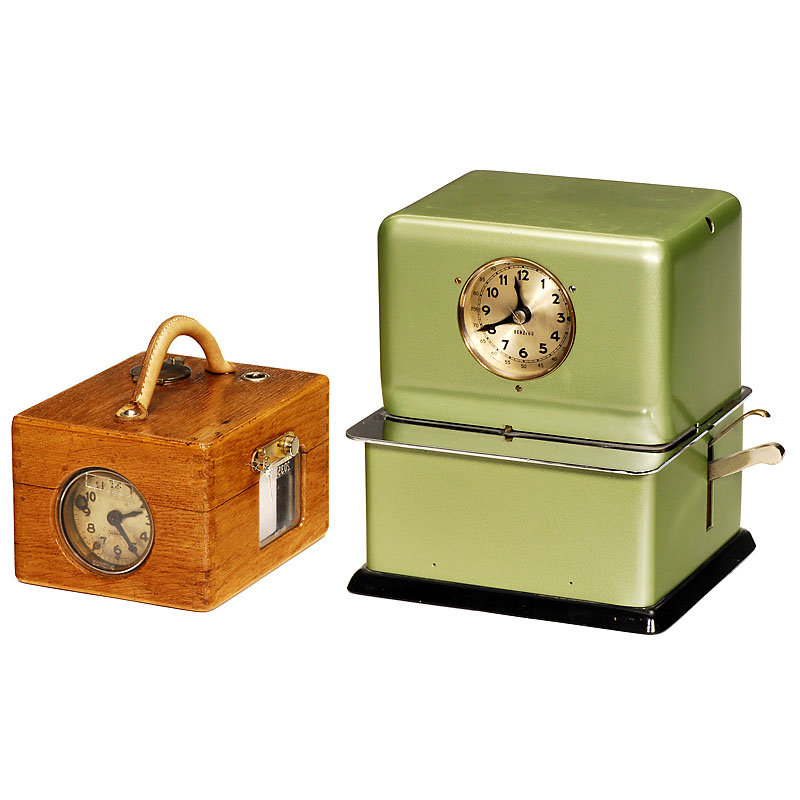 1)Punch clock, mechanical, c. 1960. – And:2)Racing pigeon clock, mechanical, c. 1950. – No keys.