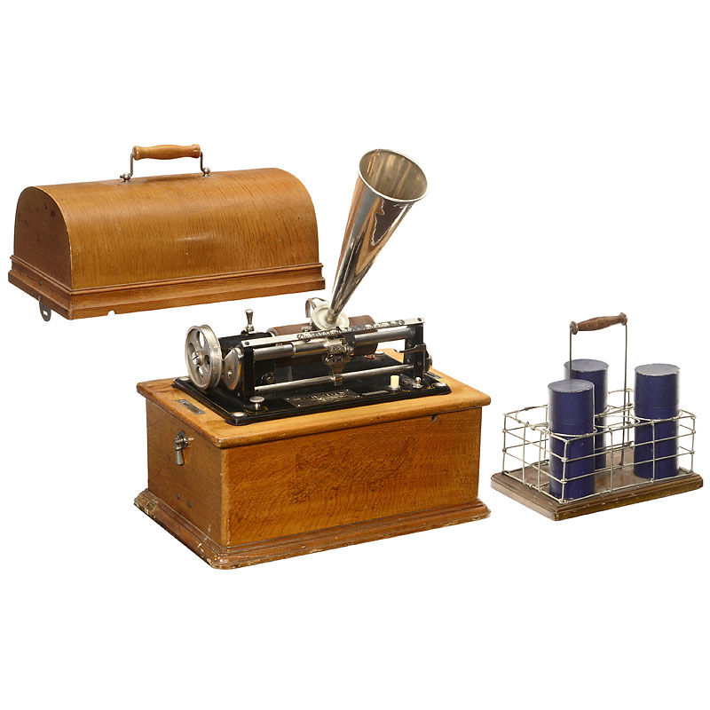 Manufacturer: Carl Lindström A.G., Berlin. Electric motor (110/220 V), wood case with lid, horn renewed, untested, with 2 phonograph cylinders and original tray. – Very interesting collector's item!