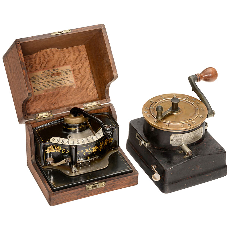 1) United States Check Punch, 1888.Nicest model of the American check writers and protectors. Serial no. 3036. In original wood box, under U.S. patent protection since May 29, 1888. – Rare! Very decorative collector's item and exhibition piece!(3/2-) – And:2) Check protector "Beebe", 1896.Manufacturer: Indelible Check Protector Co., Minneapolis, MN. – A solid design and very rare! (3-/3-)