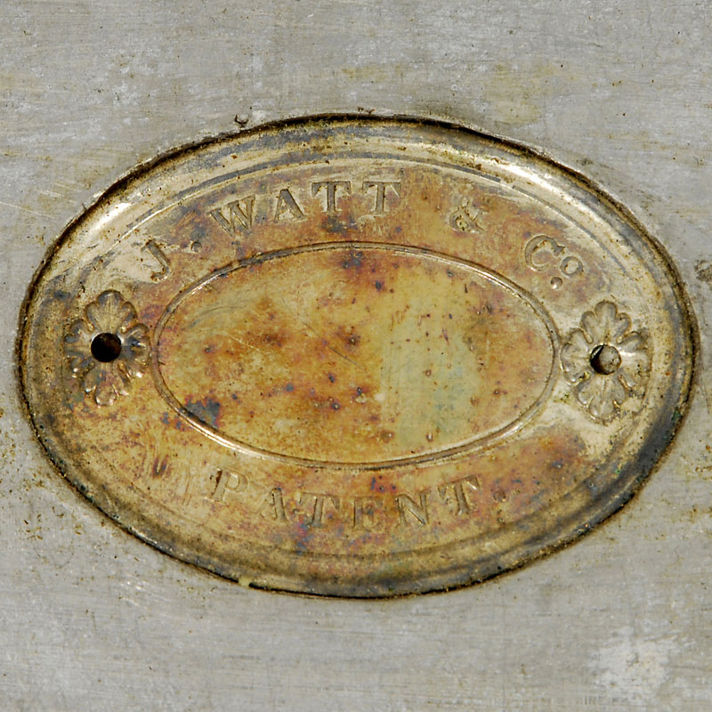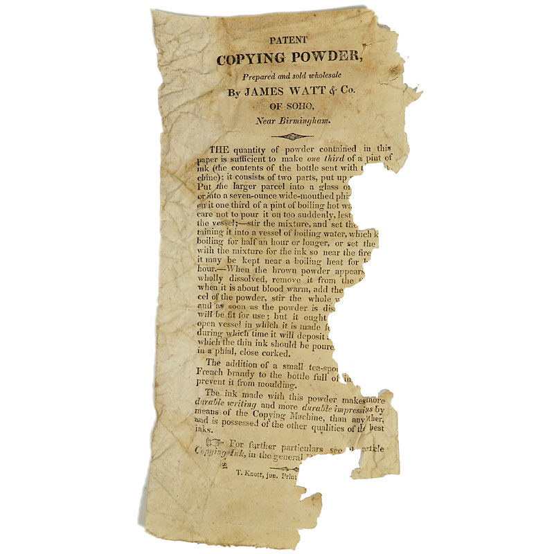 On February 14th, 1780, in England, some 230 years (!) ago, James Watt, the famous inventor of the steam engine, was granted a patent for his first duplicating machine under patent no. 1244. The machine was sold by "James Watt & Company, Soho/Birmingham, England". His invention was a result of his own business as he had permanent correspondence with his partner Matthew Boulton while traveling – mostly to his steam engine projects in Cornwall. James Watt was too often very frustrated when he received a letter after several weeks with answers by M. Boulton to his written questions because he had no copies of his own letters, of course! – So he started developing the world's first portable copying press!And by the end of 1780 150 machines had already been sold, and 630 presses by the end of the first full business year! – It is reported that in the early 1780s Benjamin Franklin, George Washington and Thomas Jefferson used the James Watt copying machine! In 1785 Jefferson was using both the stationary and the portable presses by James Watt & Co. – The portable case opened up on hinges, and its upper section contained a collapsible writing pad for preparing the documents. The typewriter had not yet been invented, and copies could bemade only of handwritten letters, diagrams and drawings which were made with a special copying ink! Underneath the writing pad were compartments for pencils, pens, rulers and paper, as well as a special compartment: The "damping box" which was used for treating the copying paper. After 12 hours, the sheets were thoroughly moist, and thus treated and ready to be used for copying. The number of sheets required for immediate use could be removed, and the remainder could be left in the box for up to two weeks, ready to be used at any time. – The actual copying apparatus, consisting of two brass platens which were turned via the side handle, which was also located in the bottom section of the case. The original document was placed in the copying plate in between the feltcovered, swing-up cover plate;the moist – very thin – copying paper was placed on top of it, and was then covered by oilpaper. The pressure induced by slowly turning the plate between the two platens caused the special copying ink of the original to be taken over, and thus transferred, onto the moist sheet (mirror inverted). The copy was ready for use after 24 hours in a drying book of absorbent paper. Because the ink was passed through in this manner, the printing on the copy could, of course, be read only on what was actually the reverse side of the page. The base for good copies was the special copying ink in which the original was written. A great deal of practice was also necessary to prepare sheets for use as copying paper, as they had to be uniformly moistened. The "damping box" shows the original seal of James Watt. Including moistening brush, ink pot, keys, copying paper, fragmented manual and dry ink powder. – Extraordinarily hard to find in this complete condition!