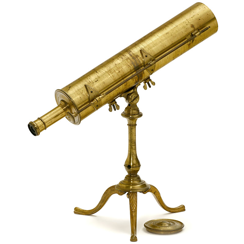 Engraved on the tube "Ja, Lynch Dublin", original lacquered brass, on baluster-turned pillar support and folding cabriolet legs, screw rod adjustment, tube Ø 2 ¾ in., length 13 in., with dust cap. Working condition. Gilt-brass decorated tripod.