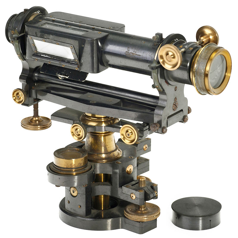 According to the D.R. patent no. 17209 by R. Wagner, signed "Ludwig Tesdorpf – Stuttgart", no. 206, oxidized brass, 2 bubble levels, rack-and-pinion focusing objective, length: 9 ½ in., height: 8 ¼ in.