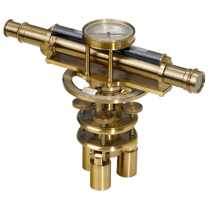 Unsigned, original lacquered brass, silvered scales and compass rose, spirit level, rack-and-pinion telescope adjustment, length 11 ¾ in., overall height: 9 in., excellent condition!