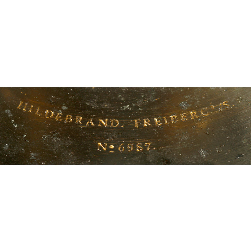 Signed on the horizontal plate "Hildebrand, Freiberg i./S., no. 6987", original oxidized and lacquered brass, oculars with micrometer, 2 striding levels, 4 telescopic magnifiers, 2 swing adjustable reflector mirrors, silver scales, length of the telescopes 18 1/10and 15 ¾ in., overall height 19 ¾ in.