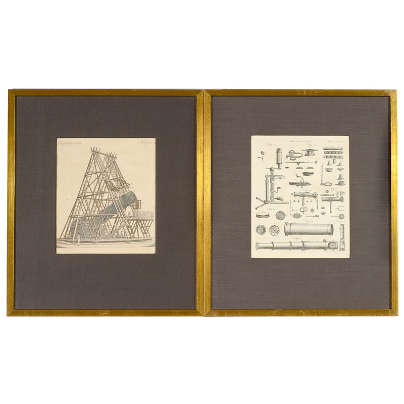 1)4 microscopy plates with credit "A. Bell Prin. Wal. Sculptor fecit", showing Culpeper, scroll, screw-barrel, pillar and other microscopes. All 7 ½ x 9 ½ in. without frame. – 2)1 plate with credit "Benard Direx", showing a solar microscope, 9 x 14 ½ in. without frame. – 3)2 astronomical plates with credit "Benard Fecit", showing a transit telescope and a heliometer, all 9 ½ x 14 ½ in. without frame. – 4)1 observatory plate showing an historical construction, hand-colored, 7 ½ x 9 in. without frame. – And:5)2 surveying instrument plates with credit "Henry Winkles", showing theodolites, telescopes and other instruments, all 10 ½ x 8 ¾ in. without frame.